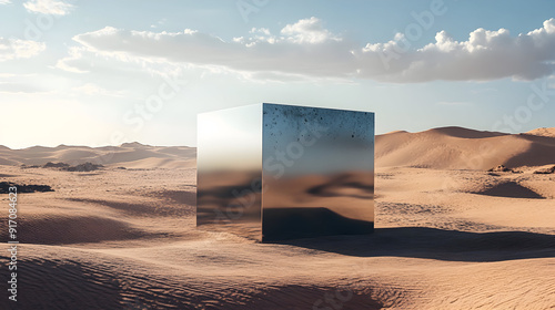 A dreamlike terrain featuring a metallic cube situated within a desert environment illustration