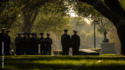 Silhouetted military honor guard at a solemn funeral ceremony. Remembrance