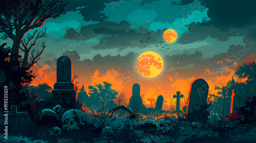 spooky cemetery with a full moon and bats flying around