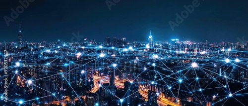 High-tech infrastructure network with smart grids and connected urban systems illuminated at night