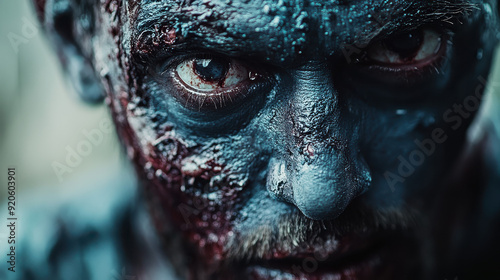 Intense close-up of a person's face with blue and red makeup, giving a haunting, eerie look suitable for horror or thriller themes.