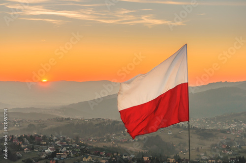 Biało-czerwona flaga Polski na tle zachodzącego słońca w górach - Ochodzita, Koniaków