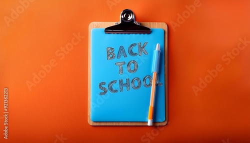 The phrase "back to school" is displayed on a piece of blue paper attached to a clipboard, set against an orange backdrop.