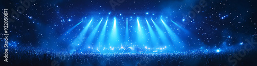 Crowded concert hall with blue stage lights and starry atmosphere, audience in silhouette, vibrant live performance