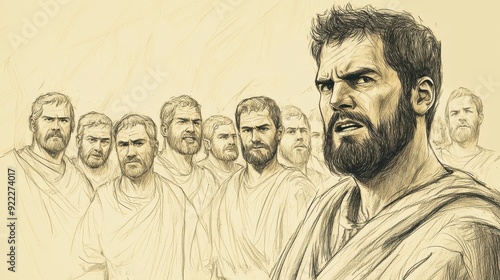 Biblical Illustration: Absalom, with a charismatic expression, addresses a gathering of influential men, convincing them to join his cause, set against a beige background for Bible wall art.