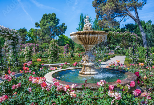 View of the fountain in the Rose Garden at El Retiro park. Madrid.