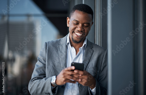 Black man, phone and happy in office for professional career, good news and business opportunity. Human resources, mobile and manager with smile for recruitment, networking and talent acquisition