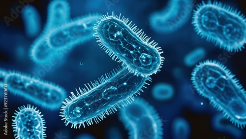 A bright close up microscopic photo of tuberculosis in black and blue color palette. Bacteria microphotography healthcare or science concept. Colorful macro illustration of monkeypox virus concept.