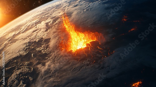 Cataclysmic Supervolcano Eruption: Fiery Ash Spewing into Space with Lava Flows on Earth's Surface