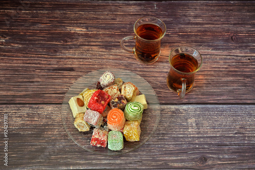 A plate with a variety of oriental sweets and two cups of hot black tea on a wooden table.