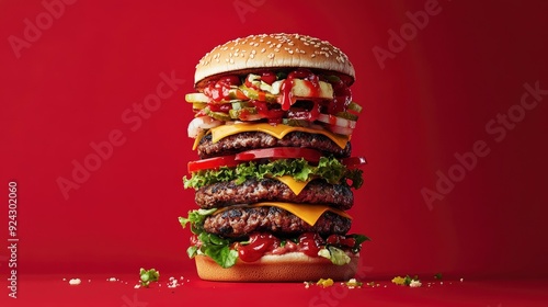 A very tall hamburger, over a red background with generative ai