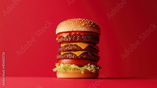 A very tall hamburger, over a red background with generative ai