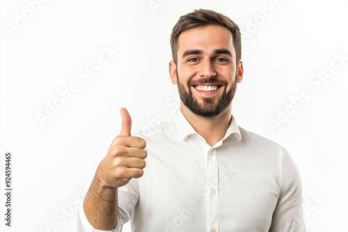Smiling office worker giving a thumbs up on a clear white background portraying professional joy and approval in a corporate atmosphere