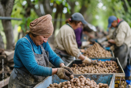 Woman farmer wearing gloves sorting walnuts into crates during the harvest season on a farm with other workers