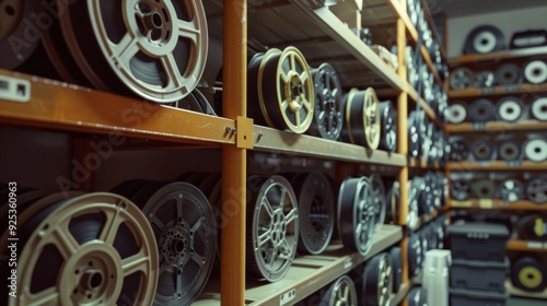 Rows of film reels are neatly arranged on shelves in a dimly lit archive room, evoking a sense of historical preservation and cinematic nostalgia.