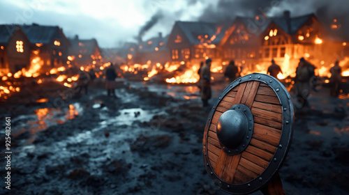A wooden shield with metal accents in the foreground, with houses burning and figures in the background in a medieval battle scene.
