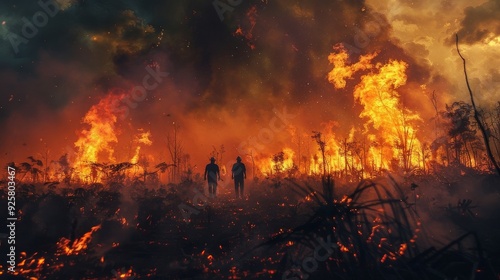 Firefighters battle a raging wildfire at dusk in a dense forest