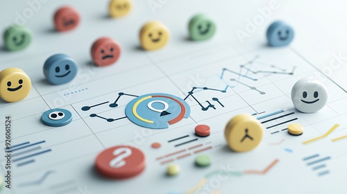 Consumer sentiment analysis, emotive faces and colorful charts, 3D illustration