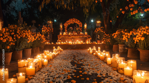 A vibrant altar setup featuring marigold flowers, candles, and decorative sugar skulls, honoring Día de los Muertos traditions in a warm candle-lit environment.