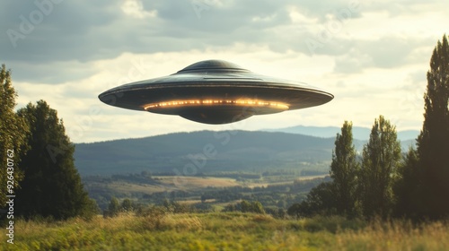 Mysterious ufo encounter and alien abduction with flying saucer in rural countryside