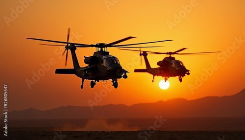 Two attack helicopters fly side by side against a glowing sunset backdrop.