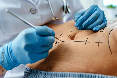 Close-up of hands drawing correction lines on a man's abdomen