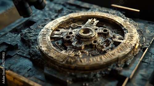 The Antikythera mechanism features elaborate gears and inscriptions, showcasing its complex design in an archaeological setting