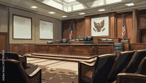 American eagle, flags, wooden podium, and chairs.