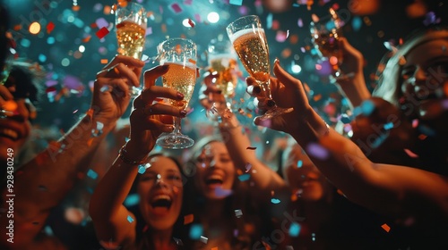 Friends celebrating with colorful shots, surrounded by confetti and streamers, at a New Year's Eve party.