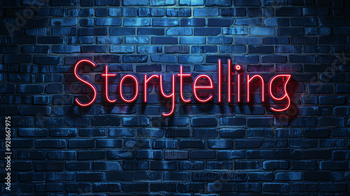 Illuminated red neon sign on dark brick wall with blue light, reads storytelling