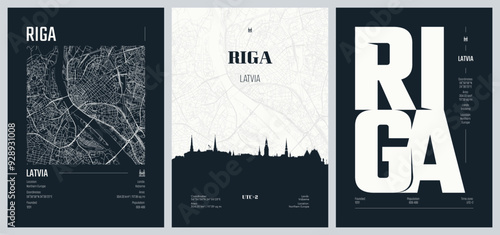 Set of travel posters with Riga, detailed urban street plan city map, Silhouette city skyline, vector artwork, set 2