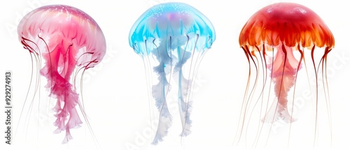 Three jellyfish in pink, blue, and red hues float against a pristine white backdrop