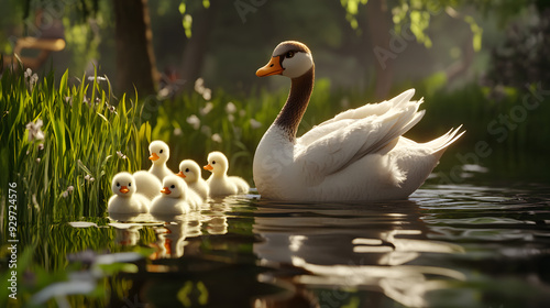 A protective mother goose guiding her fluffy goslings along the water's edge amidst lush greenery.