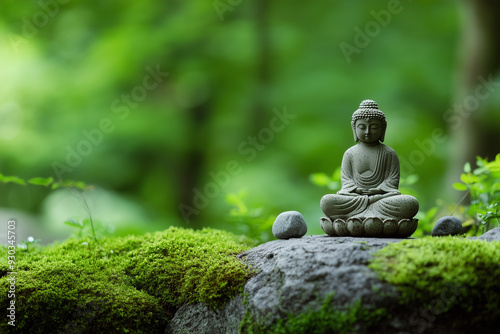 Zen scene of a buddha statue in the green garden, perfect as wallpaper for meditation.