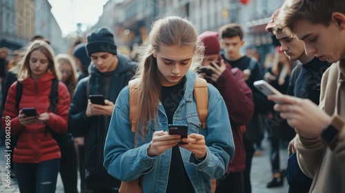 Generation z addiction university crowd engrossed in smartphones, social media scrolling, messaging
