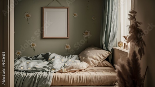 stokrotki, Przytulna sypialnia, drewniane łóżko w kształcie domku, pastelowe zielenie, beżowe odcienie, minimalistyczne dodatki, motyw stokrotek, pościel z wzorem stokrotek, dekoracje stokrotki,