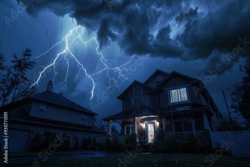 A house is lit up by the lightning and the dark sky, generative ai image