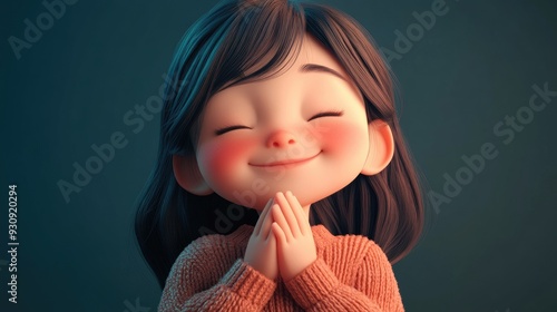 3D Cartoon of a Little Girl in a Trendy Sweater Smiling with Closed Eyes and Grateful Gesture Hands on Chest
