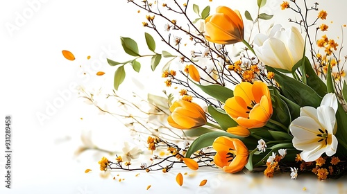 Spring Bouquet with Yellow and White Tulips and Blossoms