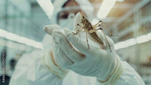 A scientist in full protective gear in a lab carefully holding a large grasshopper, showcasing laboratory research and study of insects.