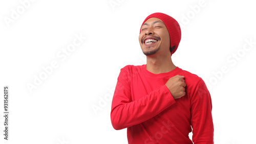 Happy Indonesian man in a red long sleeve T-shirt and beanie hat, with Indonesia flag, puts his hand on his chest while listening to the Indonesia national anthem. Isolated on white background