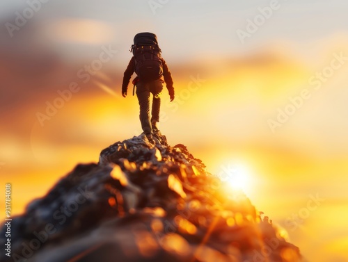 Show a hiker reaching the summit at sunrise, with a sense of achievement close up, peak accomplishment, dynamic, Silhouette, sunrise backdrop