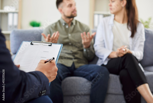 Young married upset couple man and woman sitting on sofa in counselor's office during family therapy session with male psychologist trying to find solution. Effective marital therapy concept.