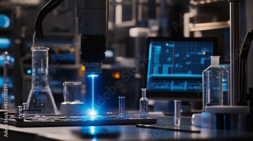 An image of a high-tech laboratory where a laser is used for materials research, analyzing the properties of a new alloy. The laser beam is bright blue, focused on a small sample, with sophisticated