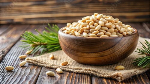 Pine nuts poured in a wooden bowl , pine nuts, wooden bowl, healthy, ingredient, organic, snack, food, close-up, natural, vegan