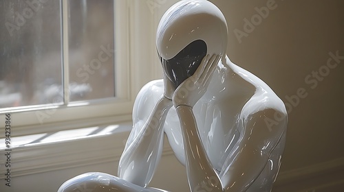 A white, human-like statue sits with its head in its hands in front of a window.