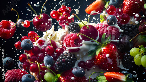 Berry salad with whipped cream on a black background. Strawberries, blueberries, blackberries, grapes, raspberries and cherries are mixed with thick natural yogurt in the air