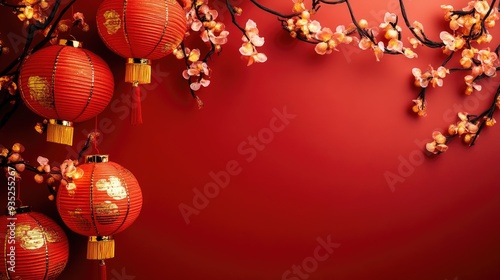 Red and gold Chinese New Year decorations with space for copy, featuring traditional symbols and festive colors.