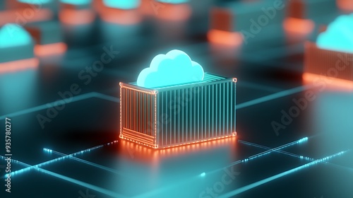 Futuristic 3D rendering depicting cloud computing with digital containers, highlighting modern data management and storage solutions.