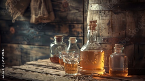 Moonshine Production: Vintage Bottle on an Old Table with Glasses in Background